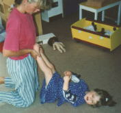 Stretching with her physio. Rebecca is wearing her flexible arm-splints.