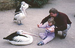 Talking with a wandering pelican at Melbourne zoo.